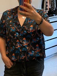 wore this a few times to work. felt like it showed better in person; on camera it looked a little "hawaiian shirt"-y. it definitely came across more navy when i was wearing black, and black when i was wearing jeans.