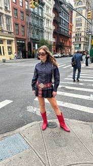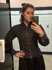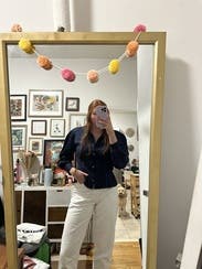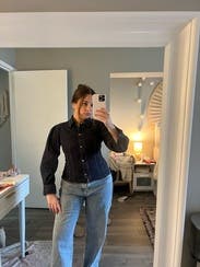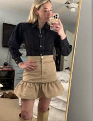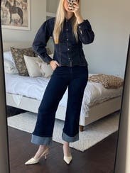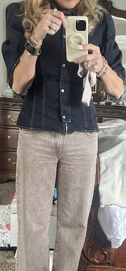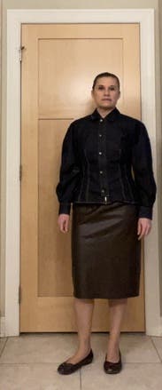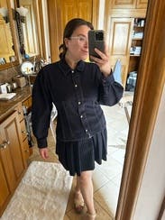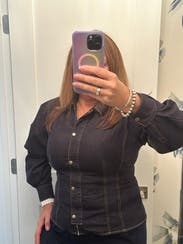 Instant purchase- this is the best denim shirt. The size 8 is slightly tight in the chest on me at 5'8, 145ish pounds with a 34D chest currently, but the zipper makes sure there are no gaps between the snaps. It's a great length, love the contrast stitching and slightly voluminous long sleeves. Could it nip in a little closer around my waist? Maybe but it's still so flattering. Can wear with so many things- I loved it with the Tanya Taylor skirt, also from RTR, but also with white & cream denim bottoms, black skirt, black slacks. It looks good with anything when you need a navy top!