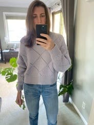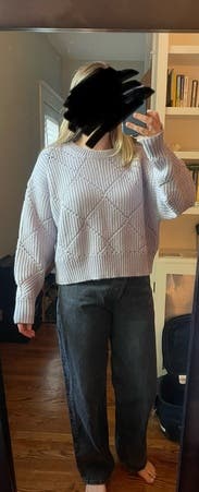 I loved this sweater. Slightly cropped, but still loose enough to be cozy. Without feeling like you'd show someone too much. The diamond pattern is really holes, so I'd wear a camo under if wearing somewhere like work.