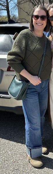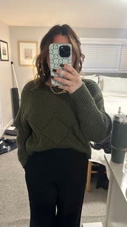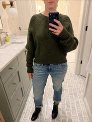 I love this sweater so much I own it in beige and wanted to wear it in green too. Super comfy and just a great fit and pairs well with anything casual.