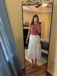 I tried this out for vacation and the style isn’t for me but I’d recommend if you like this material skirt. It poofs up a little in front but other than that good for casual wear