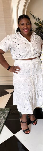 I enjoyed wearing this skirt paired with the Jason Wu white eyelet button down top. If you are a sz 0 it should fit perfect. I am a sz 2 and it was not available so the elastic waist band was a little tight.