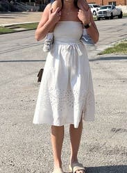 Nothing to elaborate on. An OK summer white dress. Stretchy on the bust. Nice tea length with pretty details on the bottom. Didn't love, didn't hate, just OK.