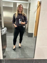 I enjoyed wearing this cute top with buttons down the back. I am short and the length and the sleeves were perfect.