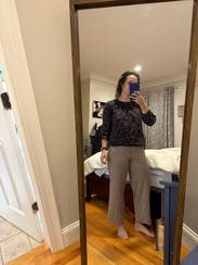 This shirt is totally fine. It would probably be cuter styled more for a date night than for work, but I wore it to the office on a more casual day. Fits my broad shoulders without sizing up.