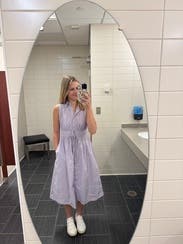 Such a perfect summertime work dress! It is very stretchy and lightweight making it easy to wear and put on. If you have a larger bust I would recommend sizing up! Although this dress is bra friendly I would recommend wearing nude undergarments. I can't wait to style this with sandals or sneakers!