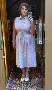 The armholes were a tad tight on this shirt dress. All cotton and lightweight, I loved the front ties and the length. Wore to work and then out to dinner with heels.