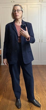 Fits well through the waist, but too short IMO. Also lacked side pockets, which annoyed me. The fabric is soft and cozy, brushed cotton so they were comfortable. Would rent again for a casual pant. Fun with the blazer but I wish the cut was a bit more flattering.