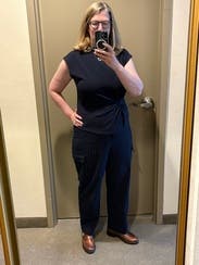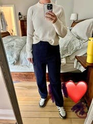 I love these pants. They’re a thick but soft material, good for cold weather. They don’t wrinkle at all, even after a 2-hour drive. They’re a petite-friendly length with a flattering high waist. The fake front pocket (diagonally-striped patch) is a little odd but doesn’t detract from the look.