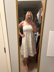 Cute white dress, comfortable but nothing I want to rent again. The waistline is at an odd place, it’s not quite empire waist but not mid waist either.