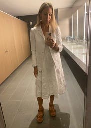I wear TONS of smocked midi dresses, so I know they can fit better than this. Something about the smocking on the torso of this dress adds bulk that just isn’t the most flattering. I love the modern take on the white eyelet dress, so I will wear it, but probably won’t rent again.