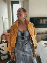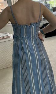 Adjustable straps, lots of volume in the skirt. I paired with a white denim jacket on a cooler summer day.