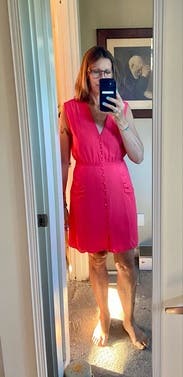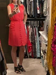 What a fun little work dress! I loved the pleating and button details, and the open back was easily toned down with fashion tape. The color is super fun in the summer. The only downside was the synthetic (= sweaty) fabric. Other than that, a total win.
