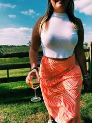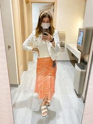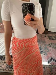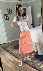 definitely more neon orange than pictured but loved! I paired with a nude top to let the skirt be the star and and i loved the skirt. So comfortable could have definitely had my true size but I was nervous the material would be clingy. It was not. such a good skirt!