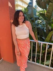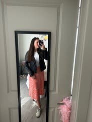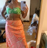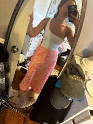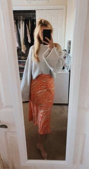 Obsessed with this skirt! Got tons of compliments, fits true to size. Like the other reviews say, it is more pink than orange. Would definitely rent again!