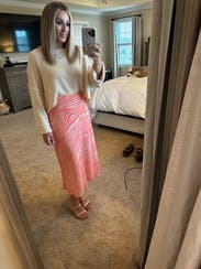Loved this skirt! I will say it does look more pinkish in person but it is still just as cute! Love the print and it was super comfortable and perfectly fitting!