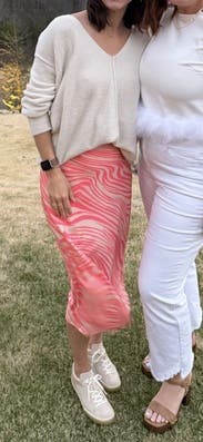 Colors are adorable. Love the nude + coral combo. The skirt definitely ran small. I couldn't zip it near my waist, so hid that with the tank top. Size up but great midi skirt!