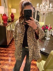 This jacket is a must rent!!! The fit is so easy and the leopard print is a fun twist on a classic style jacket. It fits on the boxier side, I would recommend sizing down for a more fitted look but I personally love the oversized look!