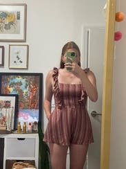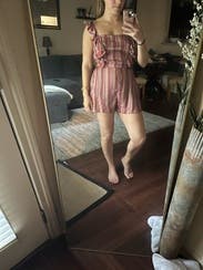 3 stars even tho I did wear it out. didn't take a photo in it. Short torso ladies - straps are not adjustable so it was definitely annoying to have to pull up straps all night at a concert. Too big on my chest as well. From the look of it though it definitely was pretty Flattering. There is a linen liner in the leg part that is very wrinkled and puffs out on the sides