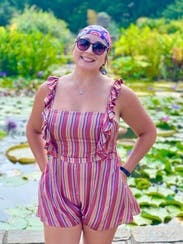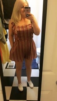 Cute, comfy romper! I paired with a jean jacket since it was a little cold and it looked great. I have a small chest and felt slightly big in that area, but shouldn't be a problem for those bustier.