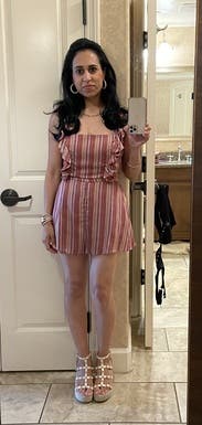 Loved how soft and thin the material was for a humid evening in Savannah. Should have ordered a medium, as it ran overall a little large. The straps are adjustable, however still long for me, so pinned them behind my back to fit. Can't really wear a strapless bra, since it sits a little low in the back. Pasties work great!