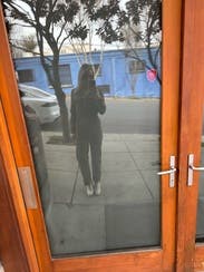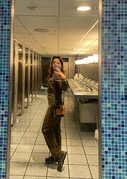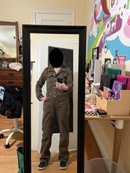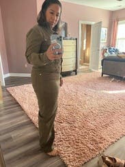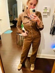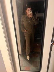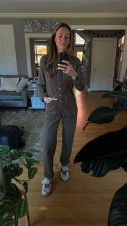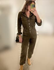 This jumpsuit is so flattering up top! Can’t be buttoned a little lower to reveal some cleavage, or higher on a cold day for warmth. I liked rolling the sleeves and it was even more flattering! The pant length was tricky. As a 5’7” person, I felt that the length was a bit short, but that was my only complaint! The color is brownish and so it feels very utility. Did not get compliments on this one, but I liked how I felt in it, especially up top.