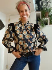 This top is super cute and easy to wear, tucked or out to show off the Pom Pom hem. Love the lace ruffles and big sleeves. Very easy fit and nice thick cotton twill. Will def rent again! I wore casually with bootcut jeans and clogs for a 60s70s vibe.