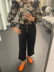 This blouse is incredible, looked great with dress pants for work, and cute also with jeans for a casual look. The details on the shoulders are great! The colors are fall perfection.