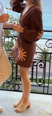 Wore this in Nice to dinner and it was perfect for the vibes and weather. The linen is a little heavier than expected so wouldn’t have wanted to wear it during the day in the high 70s and sun, but for nighttime it was great. I’m smaller chested and it was slightly large, but there weren’t any concerns about a nip slip. I also didn’t wear a bra which would’ve helped. I’m normally between an XS and S and I think the XS would have been too tight in the hips, although linen loosens up with wear.