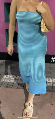 BOUGHT! This bodycon midi dress is perfect for a tropical vacation or a summer event. The snatching striped pattern sucks you in so snug! Lots of stretch for flexibility & covers the bloat (yay!). Size down if in between (or for tighter look) + had a borrow this dress who was pregnant and she looked amazing in it! more photo & video reviews @whimzylindzy