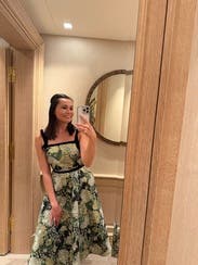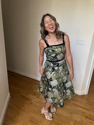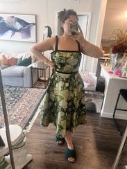 This dress would’ve been absolutely perfect in my size. They only had the 14 available when I am usually a 12 and can sometimes get away with a 10. It was gapping at the bust and waist. I tried it with a belt, but the fabric gathered too much. The straps with velvet ribbons also felt a bit flimsy, not as Luxe as they look in the picture.
