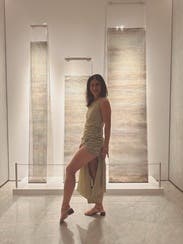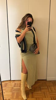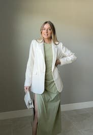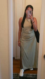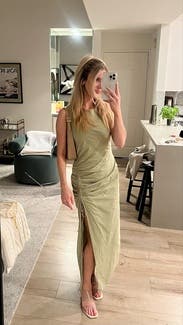 This is a very flattering dress that can easily go from day-to-night and will collect compliments the entire time - especially from other women. Boatnecks are completely undervalued for how flattering they are - they accentuate the entire form without really showing anything. The ruching looks great and can cover even a food baby. Then there is the sky-high slit... which is sexy without being too thirsty. The material is lightweight and this is an ideal dress to add to your weekend getaway bag - wear it with sneakers, wear it with flip-flops or stilettos and the dress will work. In real life the color is a very pale sage green - I know it looks beige in the RTR photos, it's not. It's a very muted sage green. Great on a variety of body types, heights and complexions.