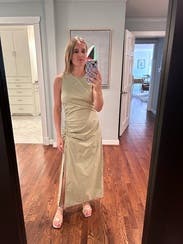 Fabric is nice and lightweight so great for hotter temperatures, you can dress up or down too. The ruching hid my post baby belly well. It time large, I sized down and it was still too big. LOVE the slit detail. It definitely is way more green looking than in the photos. Mine came with a couple of spots on it unfortunately which is why it’s 4 stars.