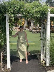 A little more of an olive hint to the dress but still light enough that it was perfect for a garden party. The ruching on the side is super flattering and the slit makes it comfortable to hang out in. Can be dressed up or down based on the materials and only needed a light steam before wearing and kept wrinkle-free pretty easily. Would rent again!