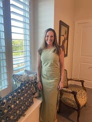 I loved this dress so much more than I thought i would. I rented it with no reviews and it came in with tags and I’m so glad I tried it. I thought it was so flattering and fit like a glove. The top is double lined so I didn’t wear a bra and the cinching up the side created such a fun slit that was comfy to walk around in. It is the prettiest shade of green (not safari at all!) and I thought it was the perfect length.