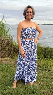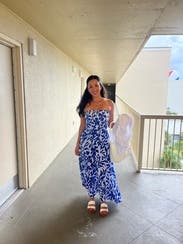 This dress fit me on bust and waist and was too long. I only wear flat shoes. I tied knots on both sides of the bottom of the dress so I would not trip. It lost it’s flowyness I loved the color, it is vibrant. The print matched the Aloha spirit. The material is very thin which made it nice and light for hot weather. I did get compliments. I might rent it again for such an occasion.