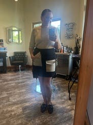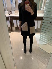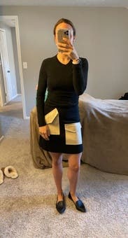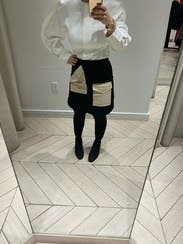 Almost purchased this versatile, comfortable, flattering, and pocketed (yay!) dream of a skirt. Cream and black are so fun to style. Perfect length for work.