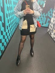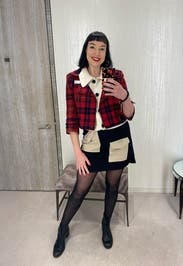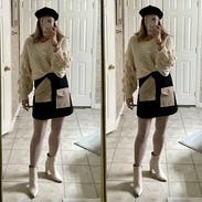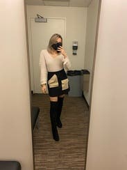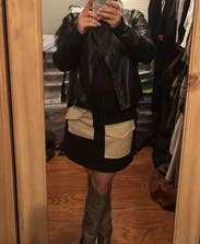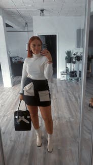 Super cute styled with tall black boots and neutral sweater tucked in! Only negative is that the zipper unzips itself slightly when the skirt is sat in.