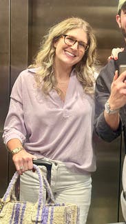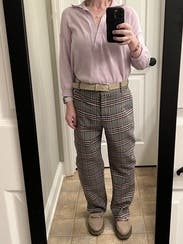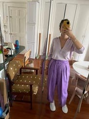 I like the color of this top. The fabric is unusual; it doesn’t feel like cotton. It drapes nicely without wrinkling. The cut is very oversized. I previously rented a medium and it was way too big, so I tried it again in a small and it was still roomy. It’s very long, but I wore it tucked in. The sleeves are 3/4 length, which I don’t love. I wish it had a button to make it less revealing.