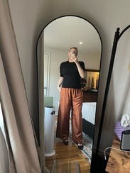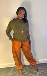 Liked these comfy pants with a shine to them. Kind of fun to wear but definitely loud - if you remember the Adidas wind pants (swishy pants as we called them), they sound like those so a little funny in a quiet office setting. But comfy and fun is how I’d sum them up.