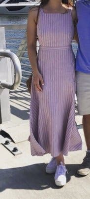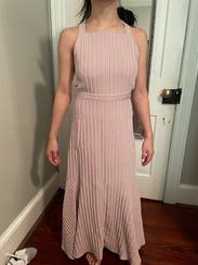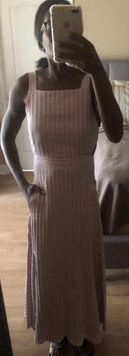 I loved this dress. It’s a purple-y pink pastel that has little details that make all the difference. There is a pinstripe and then the skirt is a slight flare. The silver snap details on the back straps are different and interesting. The pockets are also interesting in detail - but weird that they actually form a big pocket (so you can’t really use them or any item would end up poking out right between your legs ;/) the top is like an apron and didn’t really flatter the boobs and a bra would not have easily worked. Overall a 4 and I do recommend!