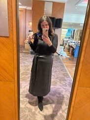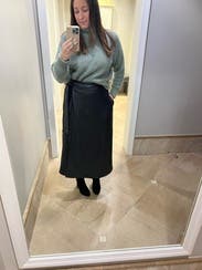 This is a beautiful wrap skirt. With pockets! I tied the sash in a knot. It has a nice heavier weight, yet not too warm. I wore it on a 75 degree late October day and it was perfect. I did have some concern the wrap adds “weight” to my hip area but overall I really liked the vinyl skirt! I paired it with the Marie Oliver Eloise top and a black pair of booties.