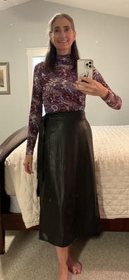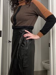 Fun wrap skirt that adds some textural interest with the faux leather. Got very well and was comfortable but the fabric did feel a bit plasticky at times.