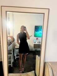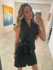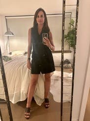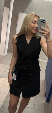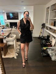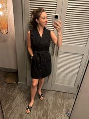 Great dress for a work conference. Flattering with the open neckline and cinched waist-tie. Love a classic black dress and the buttons & angles kept it a bit more dynamic. Thicker material so didn’t wrinkle throughout the day. Loved the length and fit of the top. Would definitely rent again