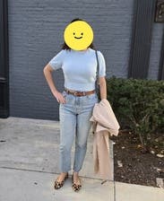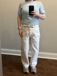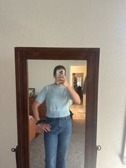 Warning to anyone with larger upper arms— the arm holes on the sleeves are small. They’re stretchy, but the puff will not puff if the sleeves are stretched. Also this sweater is cropped at the midline, so if you’re in between sizes, size up. Otherwise it will be cropped at the underboob (again with the stretch). I am so happy that this fit me like a glove. I am obsessed with short sleeve summer sweaters and powder blue has been my summer color of choice for 2025. This baby arrived NWT so I bought it! I’ve worn it to brunch and to the office, can be dressed up or down 💕