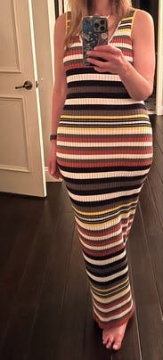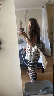 Worn to a family party 13 weeks pregnant. I wore my pre-pregnancy size (M) but I’m fitting into a street size 12/L with my bump so I recommend sizing down. It occasionally slipped down in front so you could see my bra, but it was an easy fix. Aside from that this dress was comfortable and cute, perfect with a jean jacket for a chilly late Summer evening!