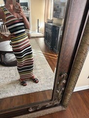 I LOVED this dress so much, I bought it!!! (And it’s new, so I normally would have just rented it a bunch of times!!) It’s thick enough to hide and “curve imperfections” and it’s really flattering. It does run big so I ordered a medium - I would have usually ordered a large in such a tight fitting dress, but the medium was great!! Only downside, but not enough to not buy, is it is long. In the picture, I show the shoes I wore with it. This can be dressed up or down.