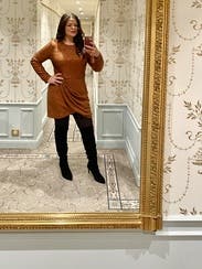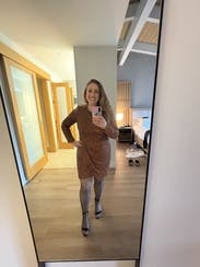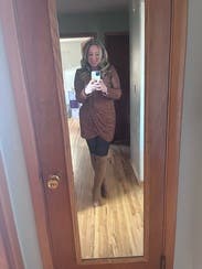 Second time renting this, this time postpartum. Sized up to 10 but could've gotten away with a size 8. Can be dressed up with heels or down with leggings and boots. A fan favorite!
