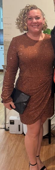 Wore for a NYE engagement party. For being a sequined dress, the inside lining is extremely soft making the dress SO comfortable! It does run a bit large in the bodice. I’m 5’3, 120-125lbs and typically like my dresses in a size 2, but the 0 fit great with a little breathing room to spare