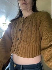 This is a great cropped sweater. It is very cropped and I felt like closing it, it was too boxy, but it is a great knit to add character simply to any outfit